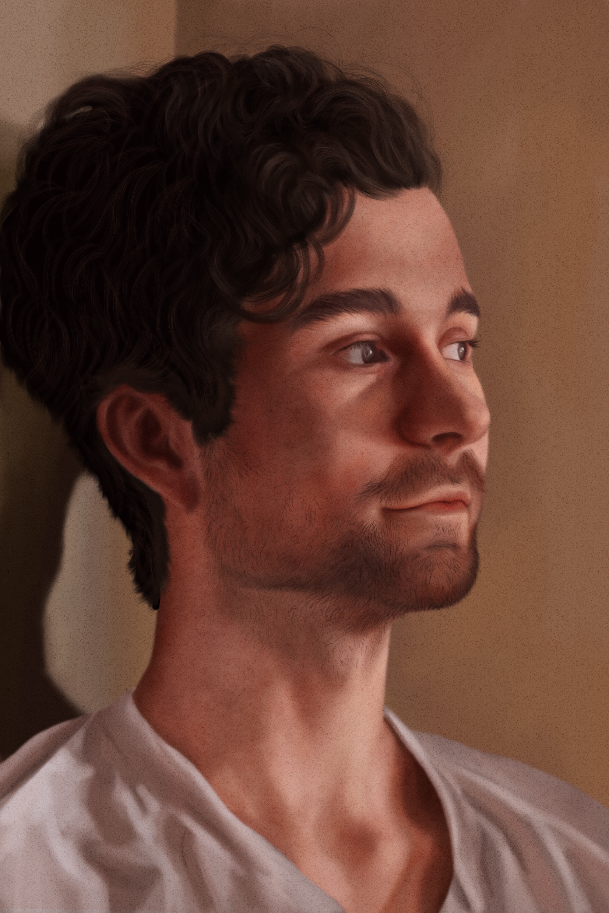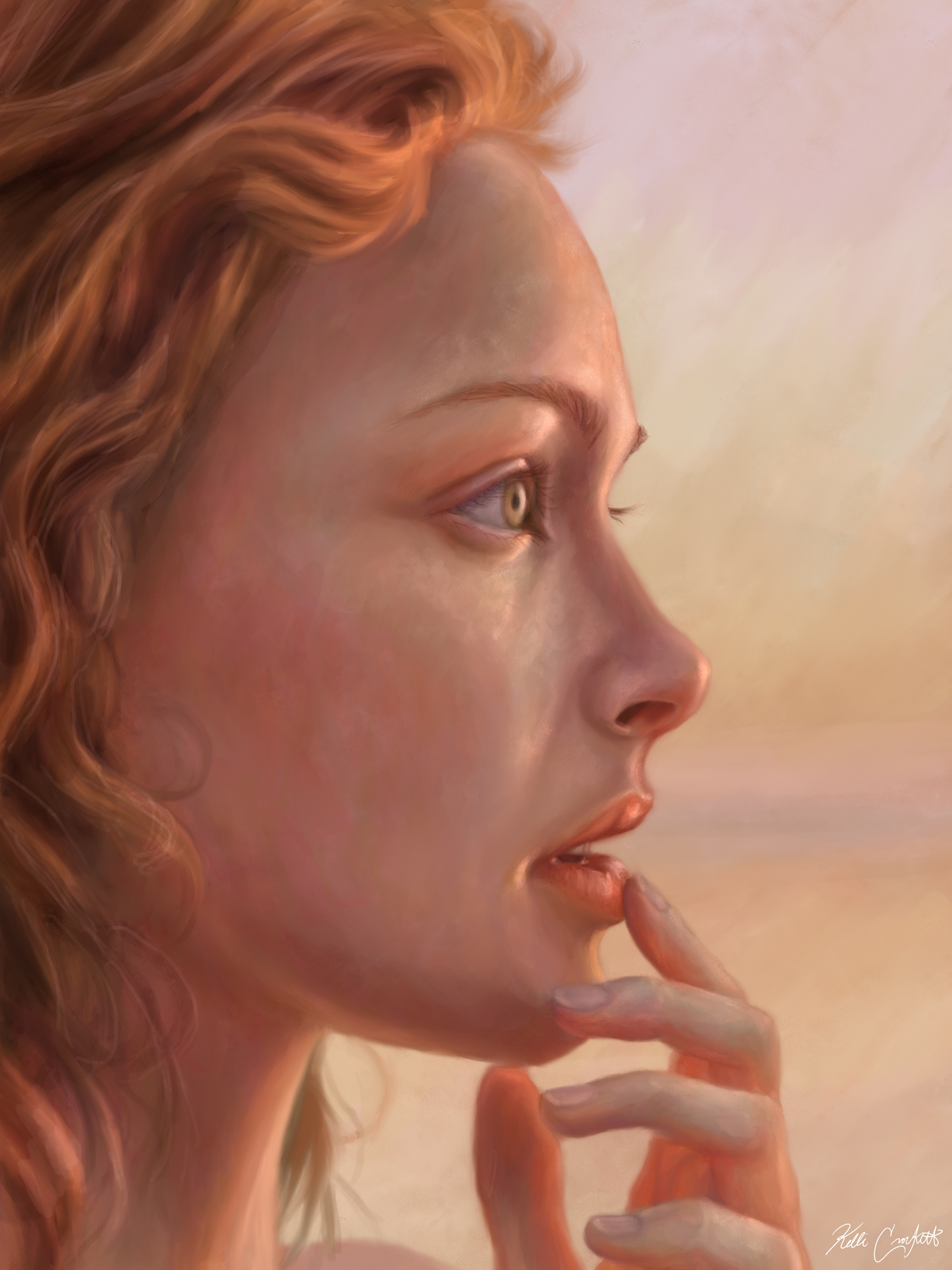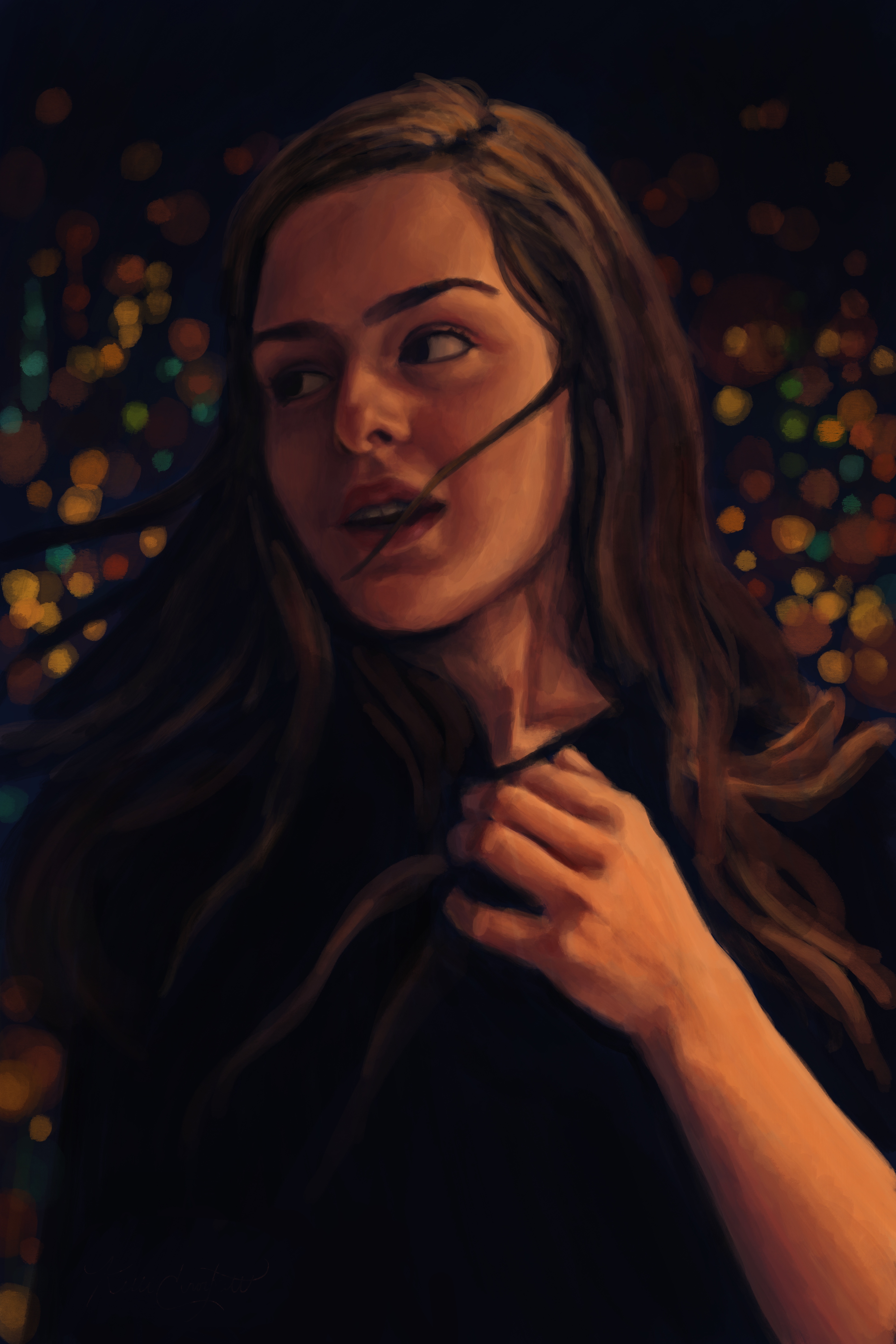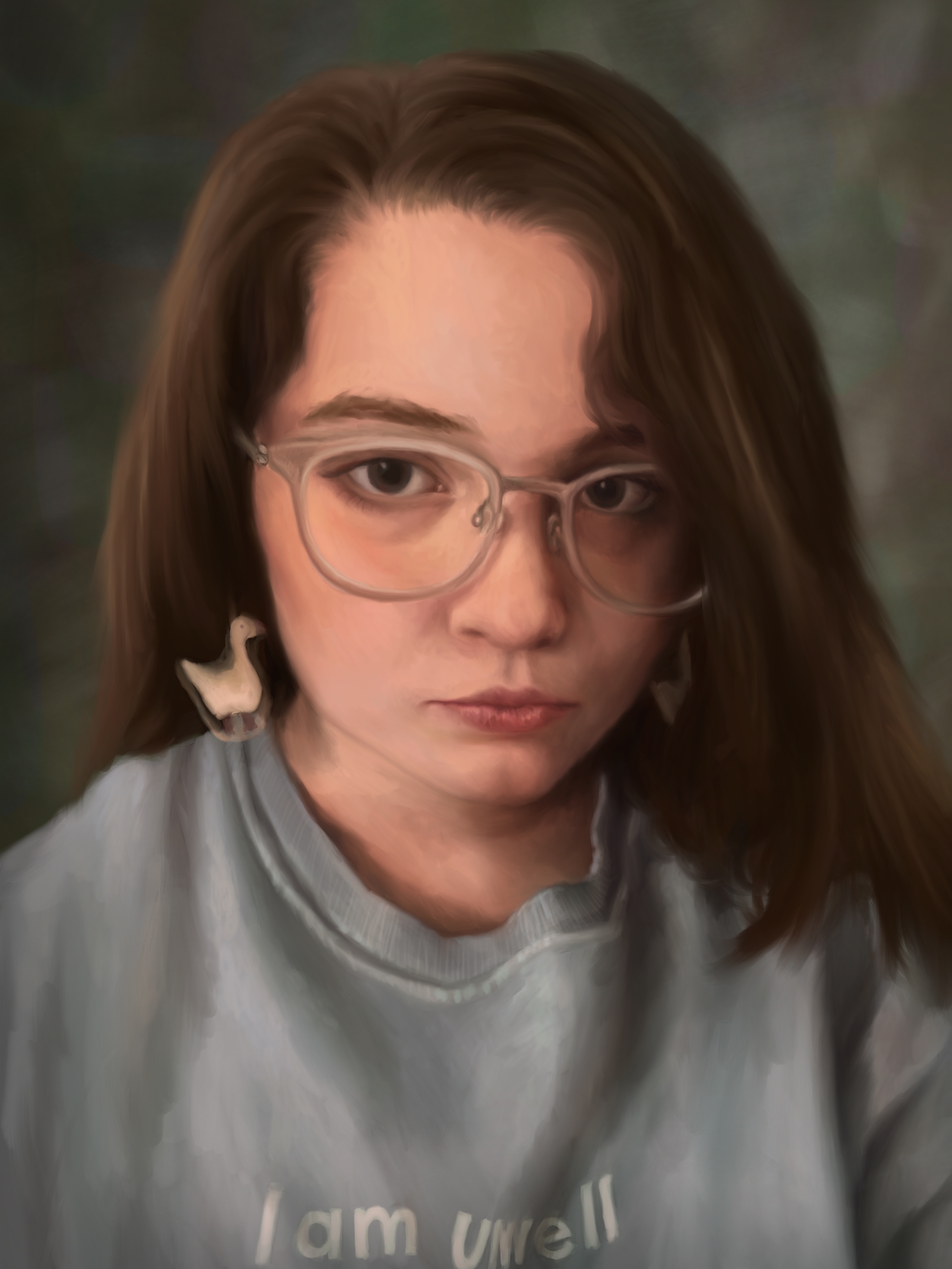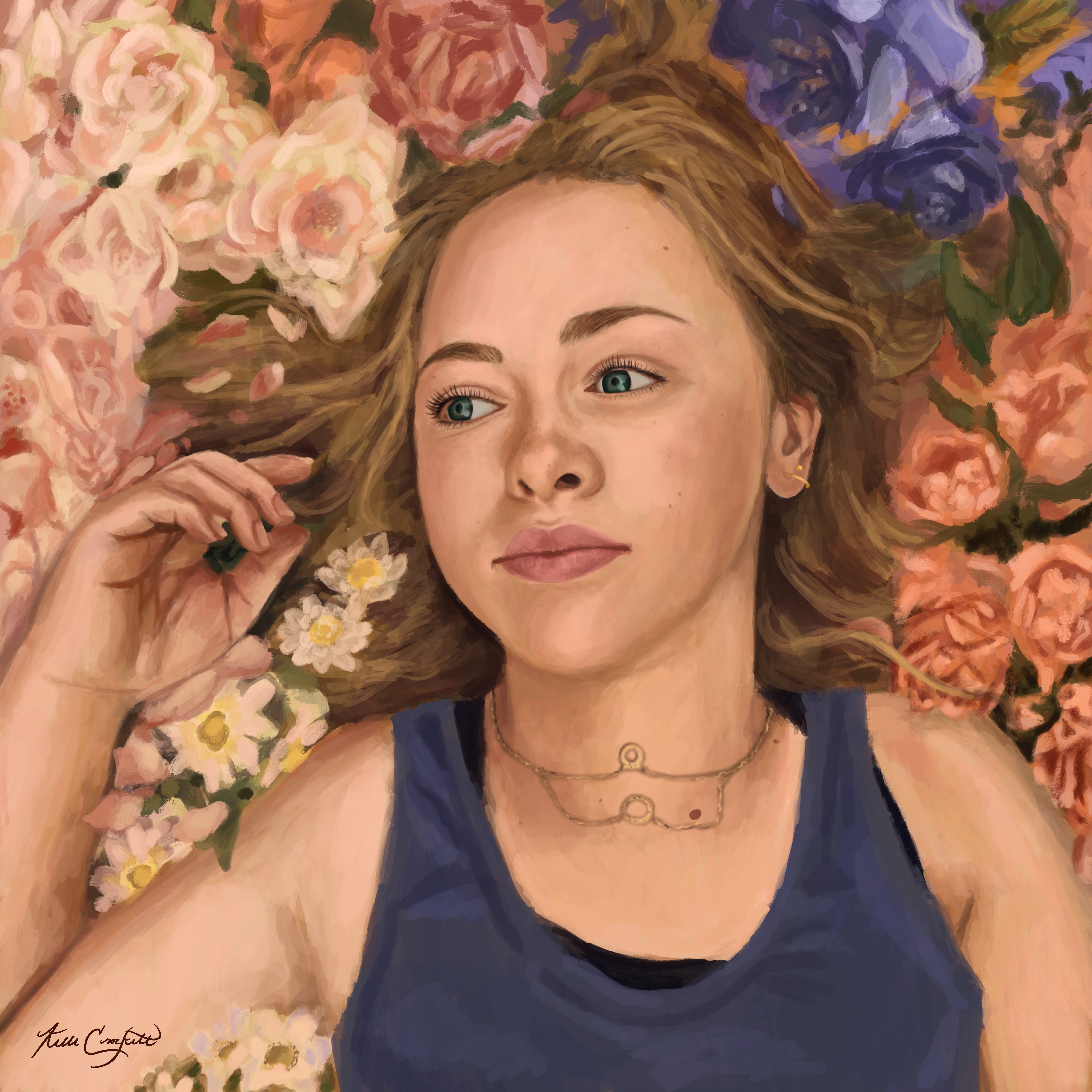 My digital paintings primarily focus on portraits and capturing the likeness of a person’s emotions, trying to distinguish how those portrayed emotions can affect the emotion of the viewer. Art imitating life, or perhaps life imitating art, or both. I found faces to be the most mysterious and alluring subjects to render because the overwhelming spectrum of emotion found there far exceeds what is visible superficially in animals, which I had most recently been working with. I wanted to paint things that were alive and I had never worked with people, who were so living that it startled me to see them come alive on the screen the longer I drew. The subtle shifting of the lips or eyebrows when painting can alter the entire expression and as a result, the process of rendering a face is the most engaging artmaking I do. Furthermore, I’m a face blind artist (I did an entire Honors Thesis research project on it in my undergraduate degree entitled “Effacing Portraits: Prosopagnosia as a Mode of Painting”) and having this invisible obstacle between myself and the familiarity of the person creates another facet of exploration in art making. When I work on faces, it feels the same as rendering a still life, since I approach them so analytically and pay most attention to color, contrast, value scales, intensity, etc. Then, all at once, I get the uncanny feeling that someone is looking back at me, and the face I have been fighting so hard to get through to breaks the surface and I think, “I’ve done it, it’s a person!” I’ve embarked on many projects at this point in my career that stray from portraiture and figure, but I feel as though I always return to this striving need to capture what’s in front of me, hold it still, and really see it, like wiping away the haze of a foggy window. That feeling will always bring me back to making art about people and the unreality of their human emotions.”