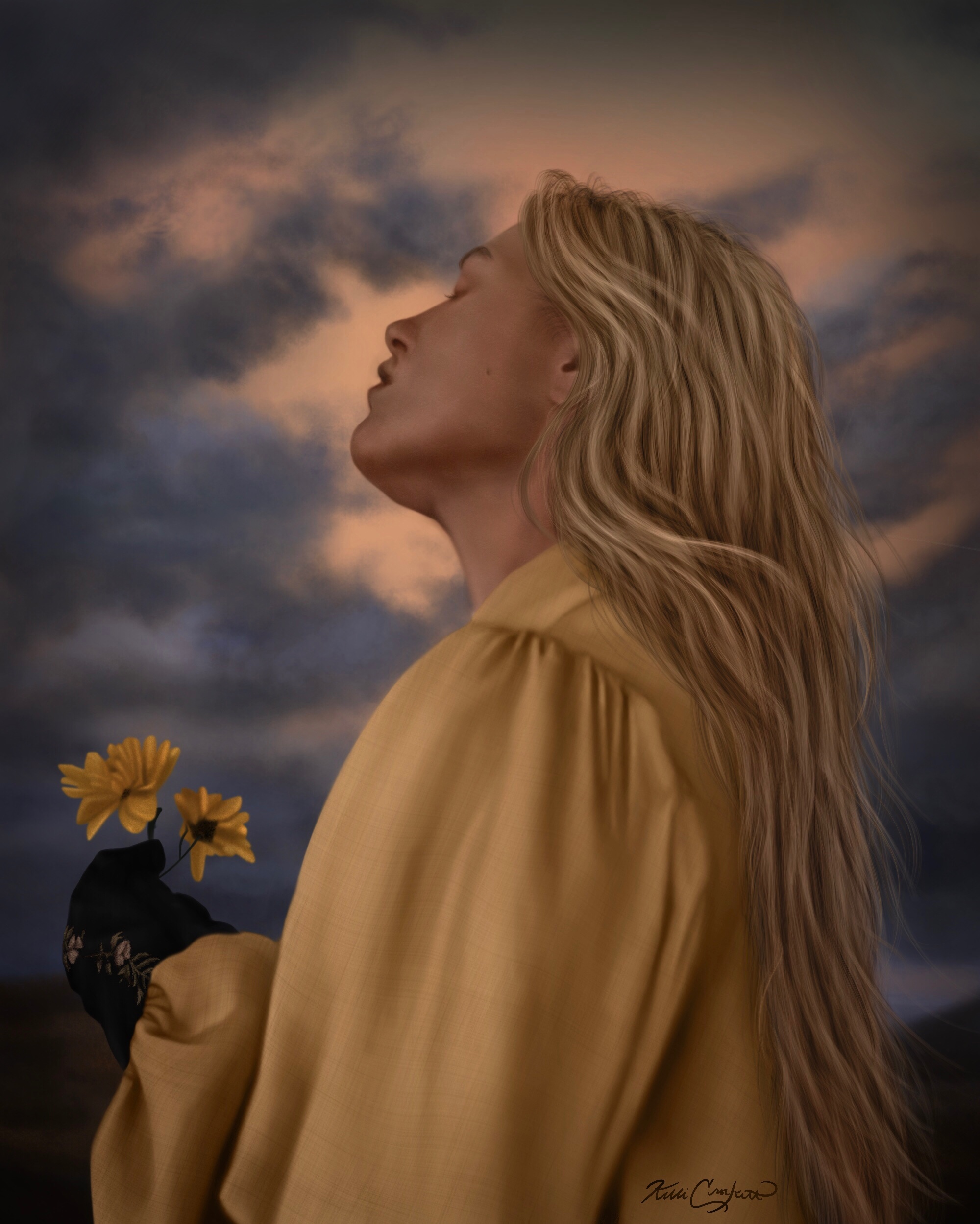 “I began painting digitally in 2019 when I got my first drawing tablet and discovered that the intimidating process of digital art held so many possibilities to expand my creative knowledge. The ability to zoom in and out, use the undo button, build layers, and inspect colors with exact measurements was groundbreaking for my aptitude to teach myself how to mimic reality in my work. It quickly became a tool to help me plan and revise my traditional artwork, but later morphed into a journey of itself. As I more quickly and accurately experimented with techniques, I found that digital painting as a medium was rewarding, enjoyable, and somehow, came naturally to me in ways that oil painting and drawing did not. It wasn’t for a long time that I realized I was making art with it at all–I always saw these as experiments and studies to further my paintings, but stopped and looked back to see I now had both the tools and the experience to start engaging in something new. It was both a gift and also frustrating to discover that I’m naturally attuned to a media I never wanted in the way I so desperately wanted to oil paint, and had to work twice as hard to paint traditionally than to do these artworks. As you can see, of course, I ended up embracing digital media alongside my love of painting, even getting degrees in both in college. I love the unique interconnectedness they share for me, even when they operate as separate media.